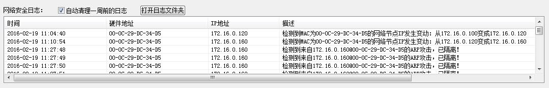 勾选此选项后,系统可以详细记录各种网络安全日志,自动滚动更新显示100条日志。同时,系统每天都会创建一个日志文件,可以点击“打开日志文件夹”查看历史记录。系统也会自动清理一周前的日志,便于节省磁盘空间。