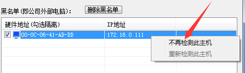 注意:当发现软件误将电脑识别为无线路由器而进行隔离时,则可以直接右键点击被隔离的电脑,然后选择“不再检测此主机”,同时将其再次放入白名单,即不再进行检测和隔离;如果您想恢复检测,则只需要右键点击,然后选择“重新检测此主机”即可。如下图所示: