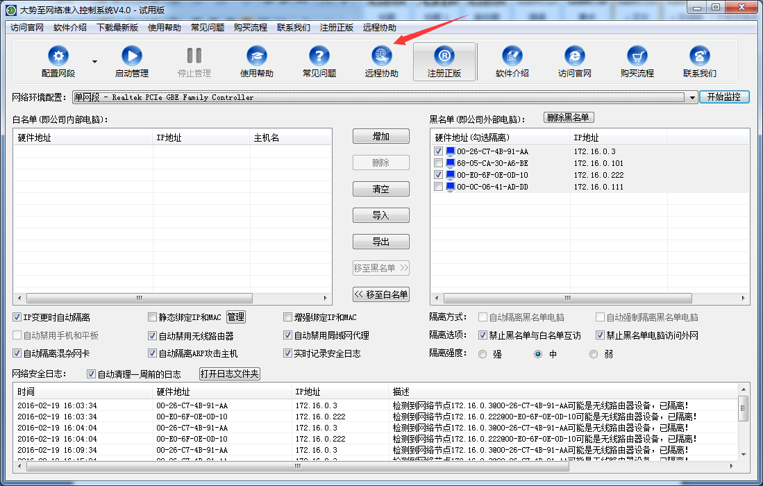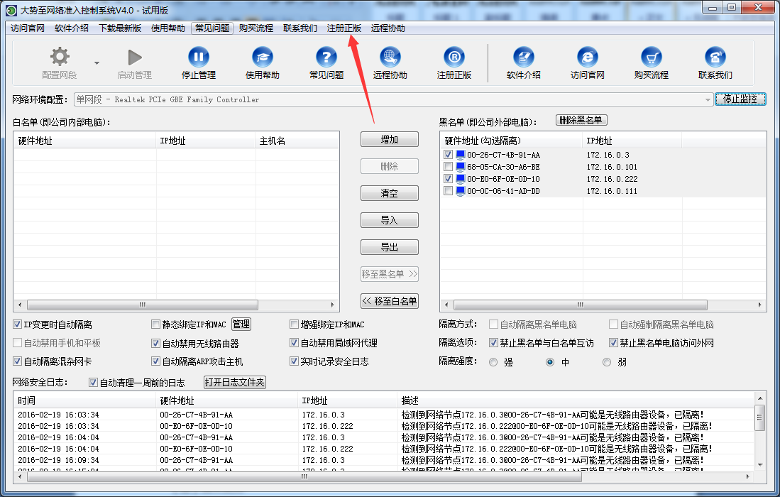 值得注意的是,在启用IP和MAC地址绑定功能后,对于白名单电脑IP地址变更时会验证两次。也就是白名单电脑如果修改IP地址后软件会因为您勾选了“IP地址变更时自动隔离”而将其放入黑名单隔离;而如果同时勾选了启用IP和MAC地址后,则如果白名单电脑修改的IP地址恰恰是您绑定的IP地址,则就不会隔离,因为其符合您的绑定规则。此外,您还可以手工修改IP和MAC地址绑定表的电脑IP地址,修改后将以您的修改为标准,不符合您绑定IP的电脑将自动放入黑名单将其隔离。