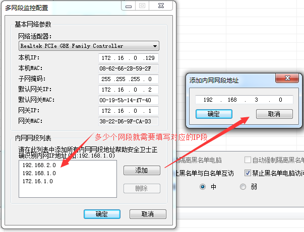 如果您有多个网段,则您需要选择“配置多网段”,然后添加各个网段对应的IP段即可。如下图所示:
