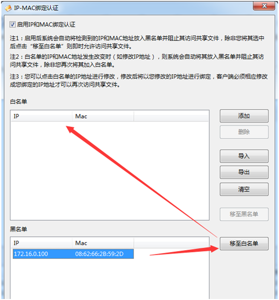 此项功能主要用来对用户访问共享文件时进行IP和MAC绑定认证,也就是只有加入绑定表内,且符合绑定规则的用户才可以正常访问共享文件,否则将予以拒绝。例如,没有加入绑定表内的外来用户将直接拒绝访问共享文件,或者绑定表内的电脑如果修改IP地址和MAC地址将会直接拒绝访问共享文件。如下图所示: